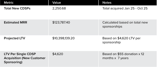 Broad Reform successfully implemented a refined digital advertising strategy across key channels (Google Ads and Meta Ads) to significantly grow its Child Development Sponsorship Product (CDSP) category. This strategic shift, focusing on customised tracking and campaign structure, delivered a 24.8% blended Year-over-Year (YOY) growth in new sponsorships. The initiative resulted in a total of 2,250.68 new child sponsorships Year to Date (Jan 25 to End Oct 25), generating $155,292.83 in Monthly Recurring Revenue (MRR) and a projected Lifetime Value (LTV) of over $13.6 million. Each new CDSP acquisition is valued at $6,069 LTV.
